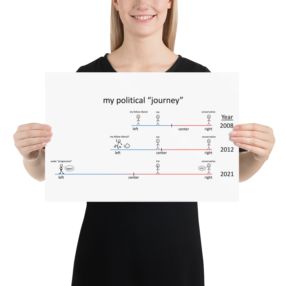 A cartoon depicting the political "journey" many liberals have been on over the last 10+ years with the rise of "woke" ideology on the Left. The image shows how the political landscape has moved beneath our feet, and we now find ourselves strangely alienated from our former party and more aligned with conservatives than woke progressives.