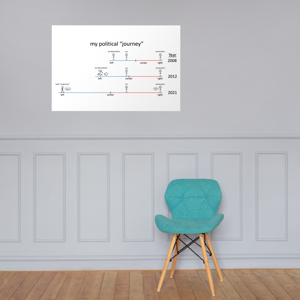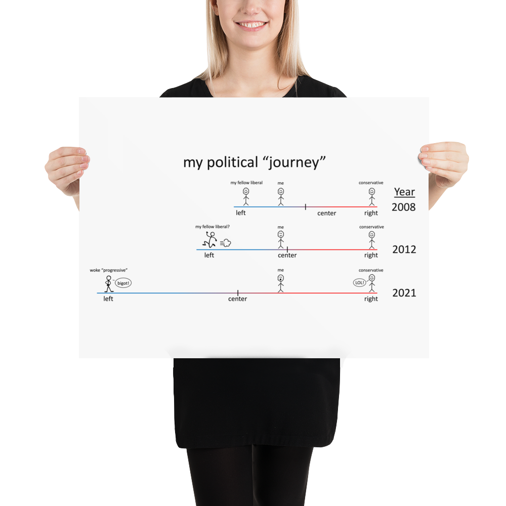 A cartoon depicting the political "journey" many liberals have been on over the last 10+ years with the rise of "woke" ideology on the Left. The image shows how the political landscape has moved beneath our feet, and we now find ourselves strangely alienated from our former party and more aligned with conservatives than woke progressives.